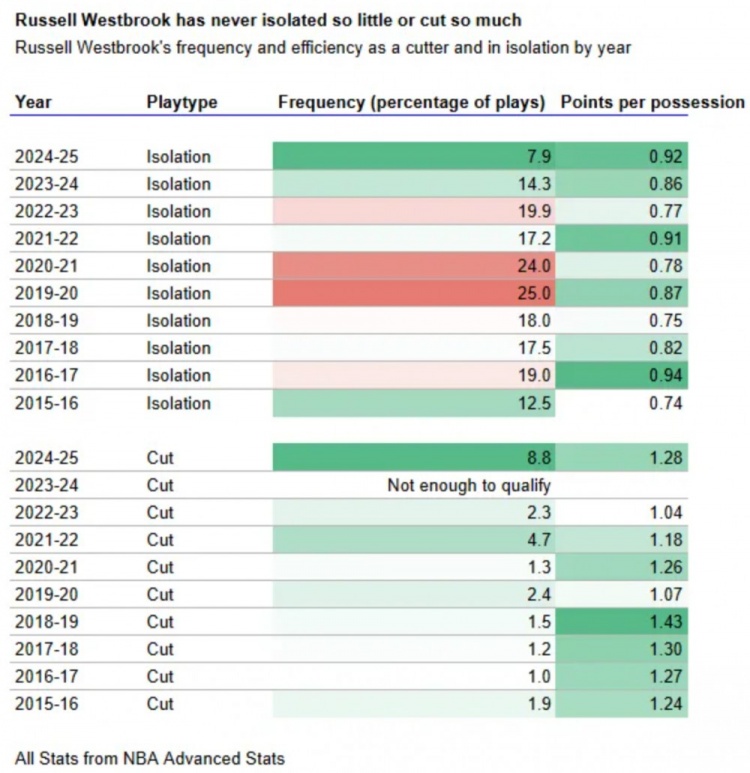 與此同時(shí),威少有8.8%的回合以空切結(jié)束,每次空切出手機(jī)會能得到1.28分。這一空切頻率也遠(yuǎn)遠(yuǎn)高于威少職業(yè)生涯的其他時(shí)期,并且首次超過了他的單打頻率(7.9%)。