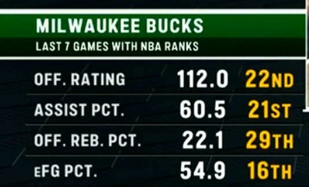 雄鹿近7場(chǎng)進(jìn)攻便秘:進(jìn)攻效率聯(lián)盟第22 助攻&前板百分比都20開外
