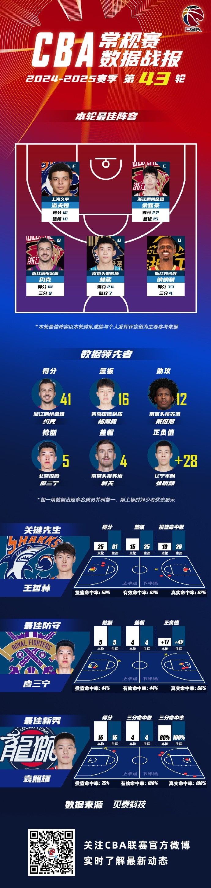 數(shù)據(jù)領(lǐng)先者方面:浙江稠州金租球員約克以單場(chǎng)41分的數(shù)據(jù)領(lǐng)銜得分榜;