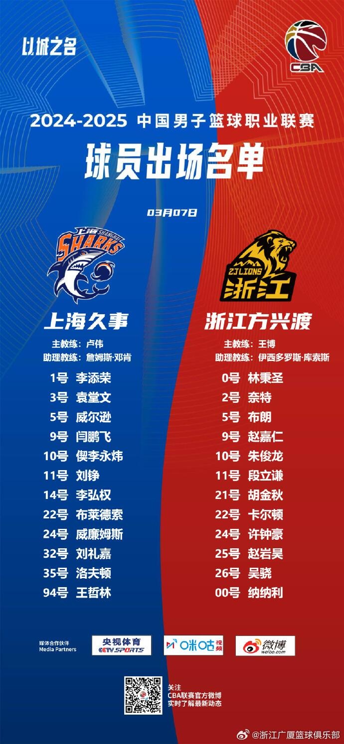 - 上海VS廣廈大名單:小胖王哲林胡金秋領(lǐng)銜 朱俊龍?jiān)诹?孫銘徽缺陣