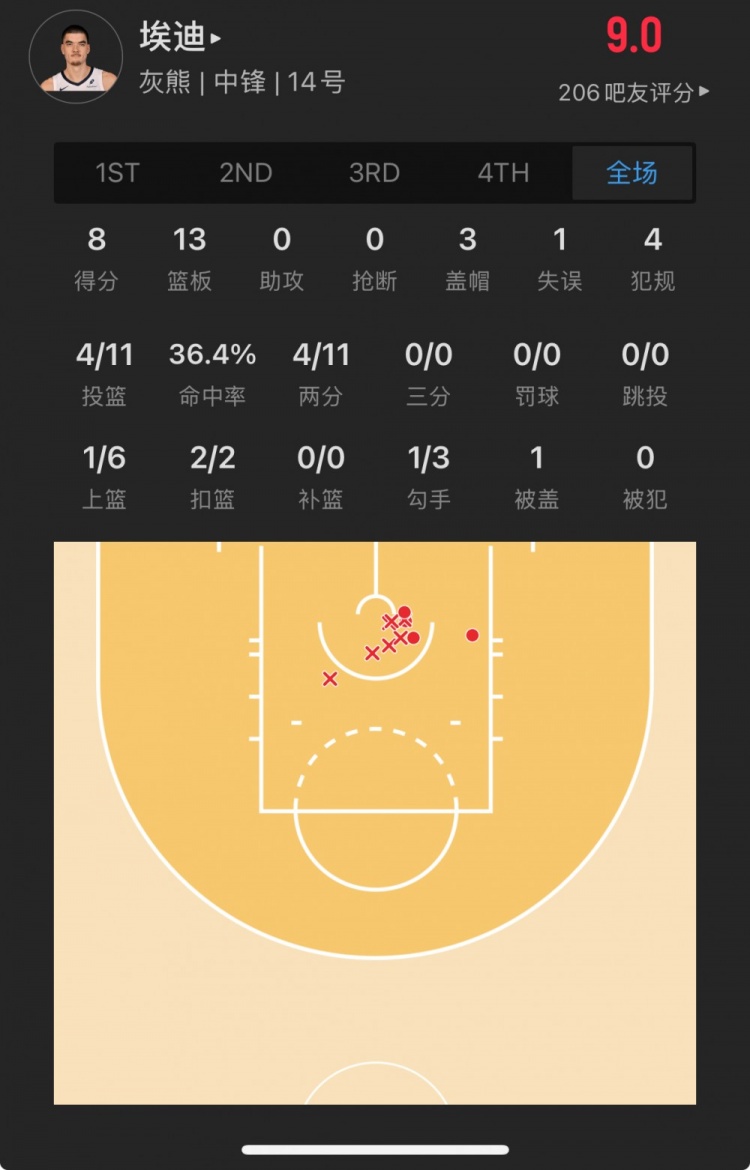 灰熊9號(hào)秀 扎克-埃迪 登場21.8分鐘