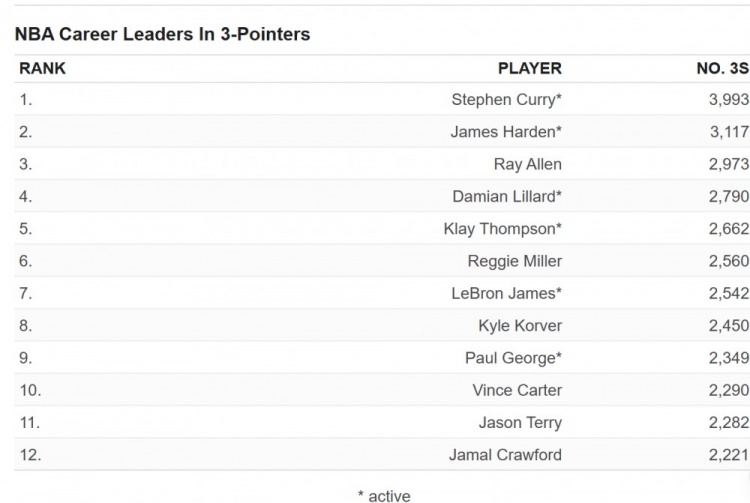 在斯蒂芬-庫里橫空出世之前,職業(yè)生涯投進(jìn)3000記三分球似乎是一個遙不可及的目標(biāo)。