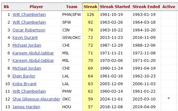 據(jù)統(tǒng)計,這是亞歷山大連續(xù)第60場比賽砍下20+,他也成為NBA歷史上第8個做到這點的球員。另外7人分別為:張伯倫、奧斯卡-羅伯特森、杜蘭特、喬丹、賈巴爾、埃爾金-貝勒、科比。
