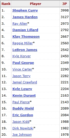 庫里達(dá)成4000記三分堪稱劃時(shí)代的成就,縱觀現(xiàn)役球員,僅少數(shù)幾位具備沖擊這一里程碑的理論可能性: