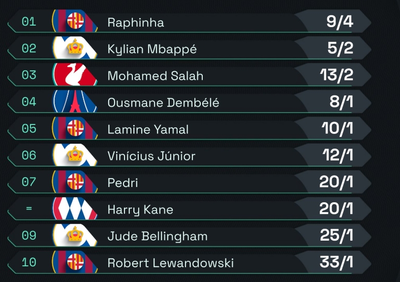 金球獎賠率:拉菲尼亞居首、姆巴佩第二,皇薩球員7人進(jìn)前十
