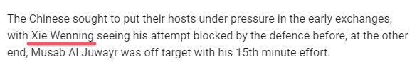 亞足聯(lián)官網(wǎng)在報(bào)道本場(chǎng)比賽時(shí)鬧出烏龍,他們?cè)趹?zhàn)報(bào)中將國(guó)足中場(chǎng)謝文能的拼音名“Xie Wenneng”寫為了“Xie Wenning”。