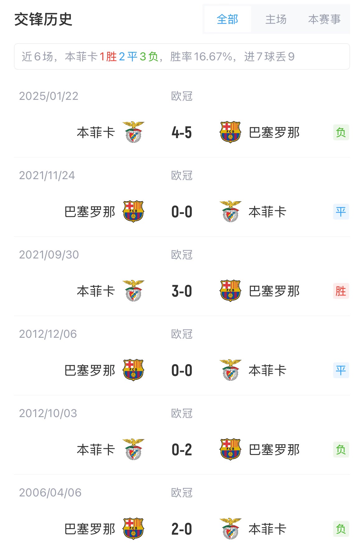巴薩與本菲卡歷史共交手10次,巴薩4勝4平2負。兩隊本賽季歐冠聯(lián)賽階段同組,巴薩客場5-4絕殺本菲卡。