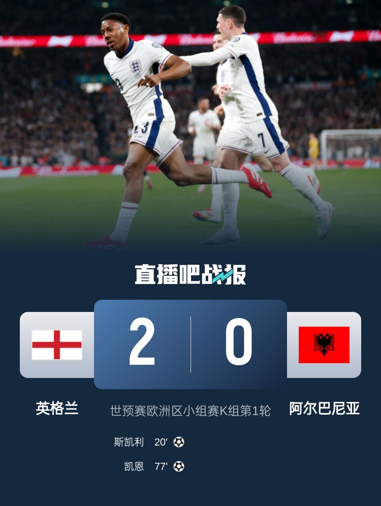 18歲斯凱利首秀迎處子球,凱恩斬獲英格蘭生涯第70球,英格蘭主場2-0戰(zhàn)勝阿爾巴尼亞。