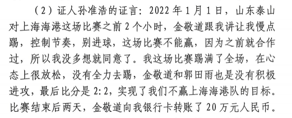 其中孫準(zhǔn)浩的證言為:“2022年1月1日,山東泰山對(duì)上海海港這場(chǎng)比賽之前2個(gè)小時(shí),金敬道跟我講讓我慢點(diǎn)踢,控制節(jié)奏,別進(jìn)球,這場(chǎng)比賽不能贏,因?yàn)橹熬秃献鬟^(guò),所以我沒(méi)多想就同意了。我這場(chǎng)比賽踢滿了全場(chǎng),在心態(tài)上很放松,沒(méi)有全力去踢,金敬道和郭田雨也是沒(méi)有積極進(jìn)攻,最后比分是2:2,實(shí)現(xiàn)了我們不贏上海海港隊(duì)的目標(biāo)。 比賽結(jié)束后兩天,金敬道向我銀行卡轉(zhuǎn)賬了20萬(wàn)元人民幣?!?/p>