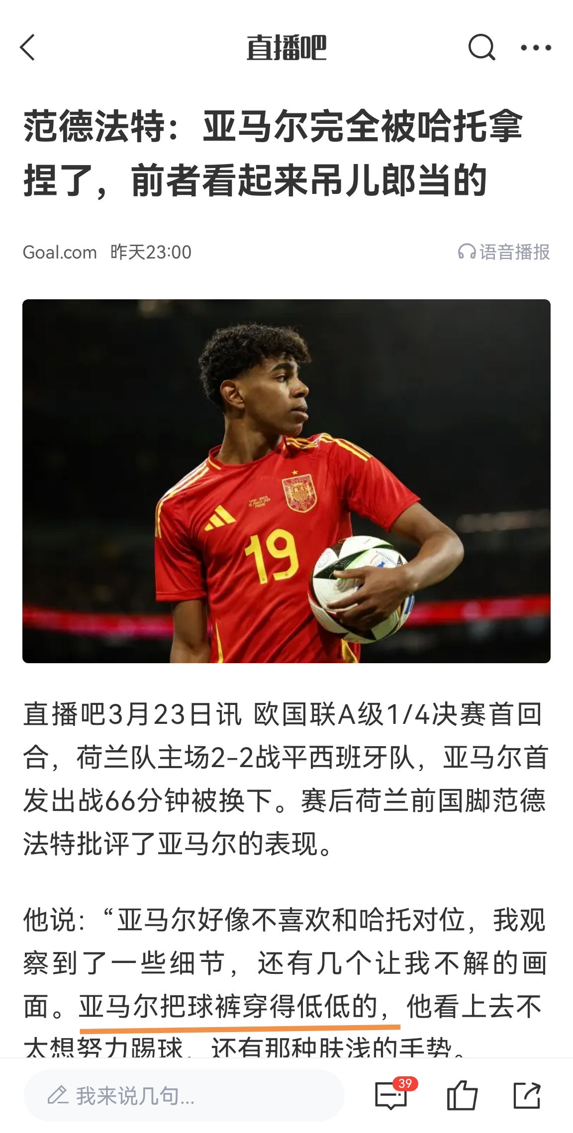亞馬爾的這一動(dòng)作顯然是有意為之。就在這場比賽前,荷蘭名宿范德法特批評了亞馬爾在首回合的表現(xiàn),甚至認(rèn)為亞馬爾“亞馬爾把球褲穿得低低的,他看上去不太想努力踢球,還有那種膚淺的手勢”。