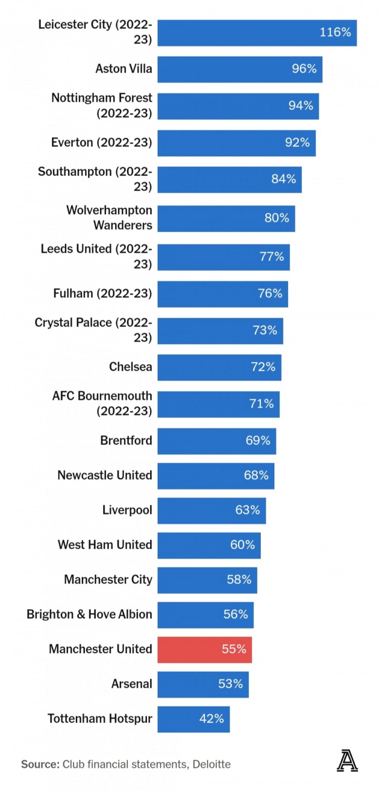 事實(shí)上,曼聯(lián)的工資收入比非常健康,是英超中工資占收入比例最低的俱樂(lè)部之一,多年來(lái)一直如此(如下圖)。問(wèn)題在于,曼聯(lián)最好的球員、高薪的球員經(jīng)常上不了場(chǎng)。以盧克-肖為例,據(jù)匿名消息人士透露,這名球員在2023年4月同意續(xù)約4年,周薪約20萬(wàn)鎊,還有額外獎(jiǎng)金。與其他曼聯(lián)球員一樣,如果球隊(duì)無(wú)緣歐冠,待遇會(huì)降低,但據(jù)說(shuō)減薪幅度低于球隊(duì)標(biāo)準(zhǔn)的25%。