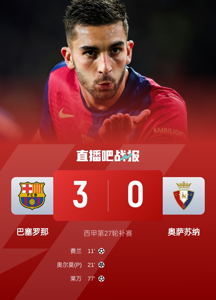 西甲第27輪補(bǔ)賽,巴塞羅那3-0奧薩蘇納,費(fèi)蘭、萊萬進(jìn)球,奧爾莫點(diǎn)球+傷退。
