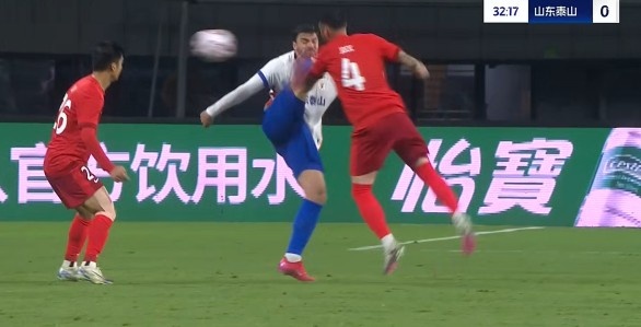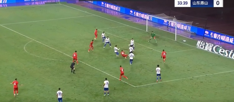 上半場(chǎng)補(bǔ)時(shí)第10分鐘,泰山隊(duì)扳回一球,陳蒲底線前傳球,卡扎伊什維利停下皮球后轉(zhuǎn)身打門得手,山東泰山1-3落后梅州客家。↓