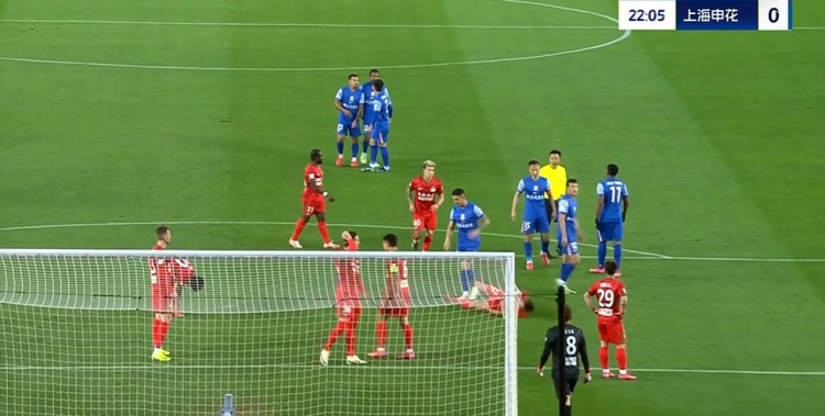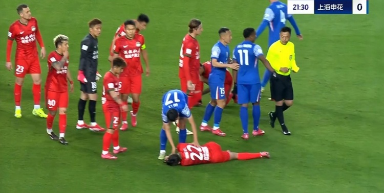 第23分鐘,申花左側(cè)角球機(jī)會,禁區(qū)內(nèi)卡位時(shí)路易斯故意推搡黃銳烽,后者倒地,主裁黃牌警告路易斯↓