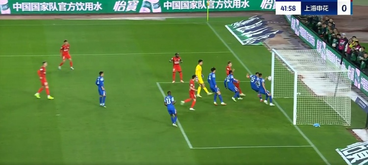 第27分鐘,申花前場左側(cè)定位球機(jī)會,高天意主罰,皮球直奔十分角,最終擊中門框彈出底線↓