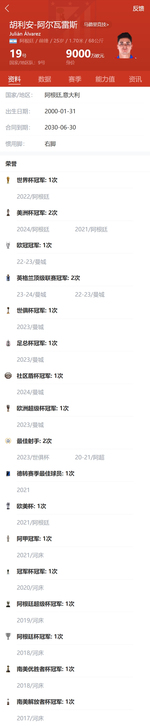 在本賽季之前,阿爾瓦雷斯已經(jīng)連續(xù)三個(gè)賽季斬獲聯(lián)賽冠軍。2021賽季,阿爾瓦雷斯隨河床奪得阿根廷職業(yè)聯(lián)賽冠軍,2022-23和2023-24賽季,阿爾瓦雷斯則隨曼城奪得兩座英超冠軍。
