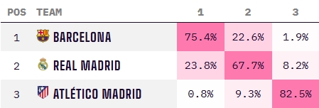 本輪西甲,馬競客場(chǎng)1-1戰(zhàn)平西班牙人,賽后多賽距離榜首已有6分之差。數(shù)據(jù)機(jī)構(gòu)Opta給出的最新數(shù)據(jù)顯示,馬競本賽季西甲奪冠概率只剩下0.8%,基本可以宣布退出爭冠。