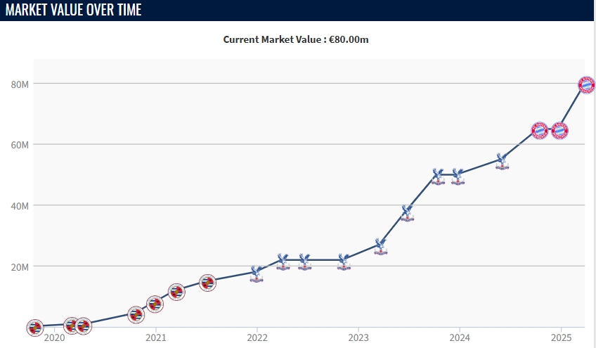 2024年夏窗,拜仁花費(fèi)5300萬歐元從水晶宮簽下奧利塞,合同簽至2029年6月。本賽季奧利塞代表拜仁出戰(zhàn)41場比賽,貢獻(xiàn)13粒進(jìn)球和13次助攻。