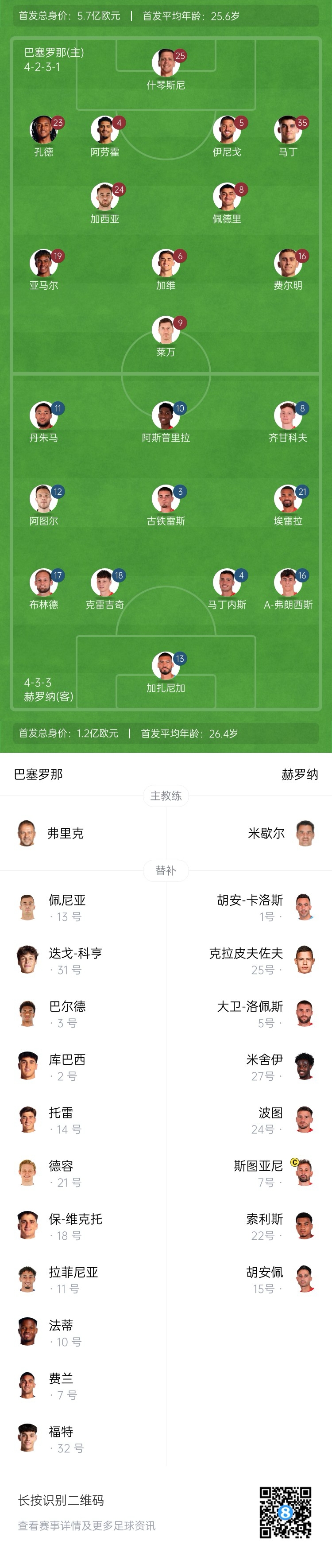 巴薩替補(bǔ):13-佩尼亞、31-迭戈-科亨、2-庫(kù)巴西、3-巴爾德、14-巴勃羅-托雷、18-保-維克托、21-德容、7-費(fèi)蘭-托雷斯、10-法蒂、11-拉菲尼亞、32-赫克托-福特