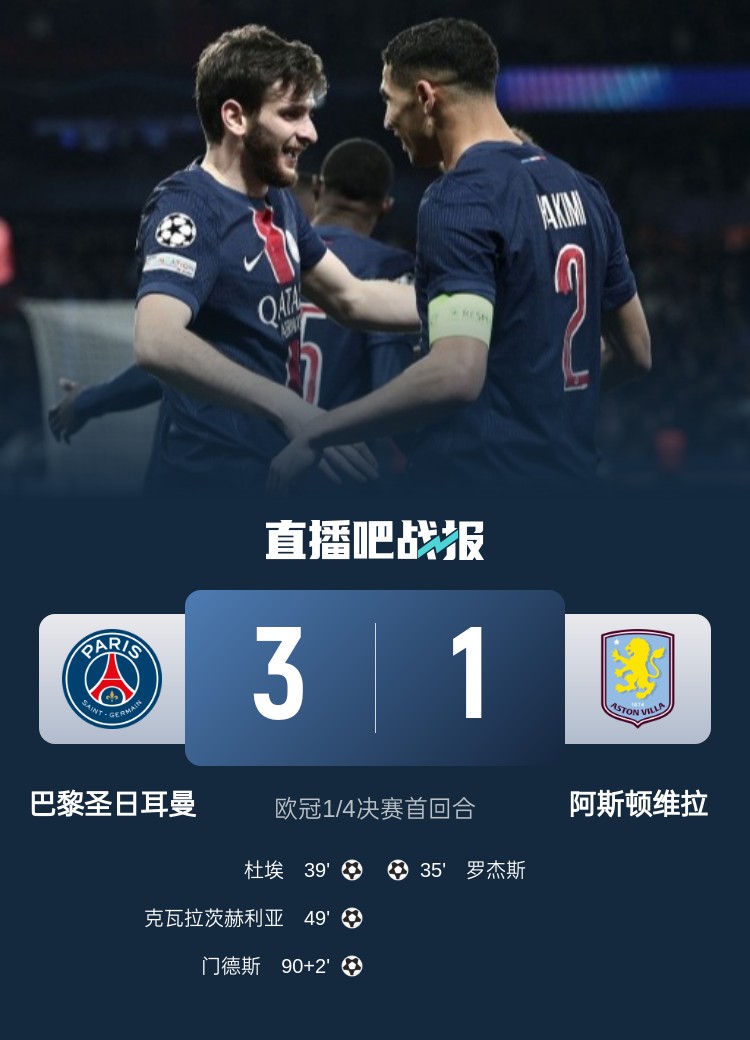 歐冠8強(qiáng)首回合,巴黎3-1擊敗維拉,杜埃破門,克瓦拉茨赫利亞精彩一條龍,門德斯補(bǔ)時(shí)再入一球。