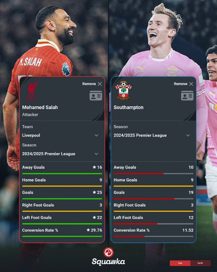 薩拉赫本賽季英超25球&轉(zhuǎn)化率29.76%,南安普頓同期19球&11.52%