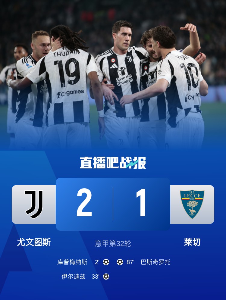 意甲第32輪,尤文圖斯2-1萊切,庫普梅納斯、伊爾迪茲進球,弗拉霍維奇兩次助攻。