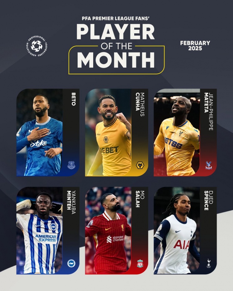 PFA英超2月最佳候選:薩拉赫、庫尼亞、馬特塔、斯賓塞在列