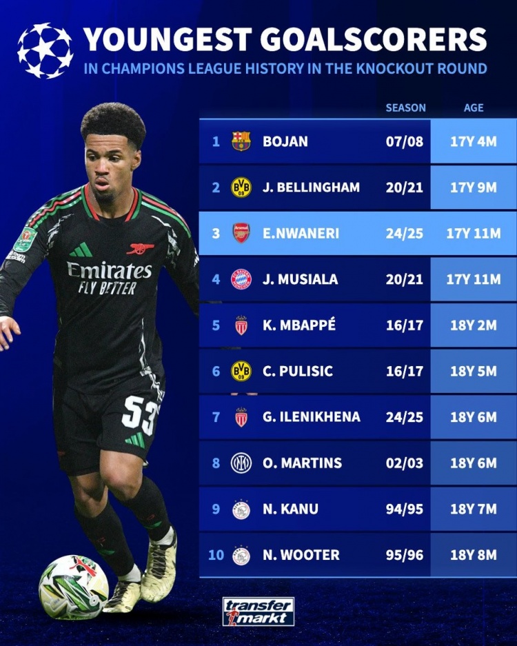 3月5日訊 阿森納在本輪歐冠淘汰賽客場7-1血洗埃因霍溫,小將恩瓦內(nèi)里破門,數(shù)據(jù)統(tǒng)計(jì)顯示他也是歷史第3年輕達(dá)成歐冠淘汰賽進(jìn)球的球員。