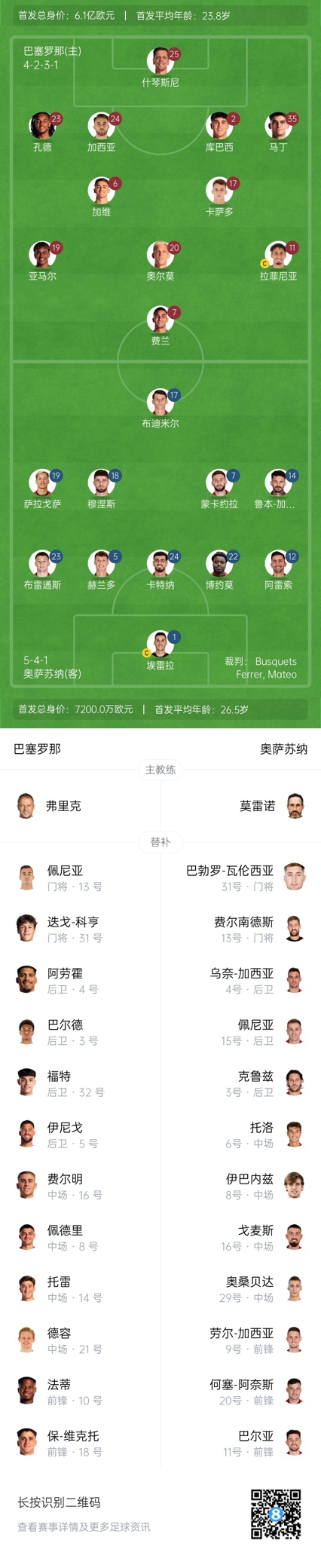 巴薩首發(fā):25-什琴斯尼、24-埃里克-加西亞、2-庫巴西、35-杰拉德-馬丁、23-孔德、6-加維、17-卡薩多、11-拉菲尼亞、19-亞馬爾、20-奧爾莫、7-費(fèi)蘭