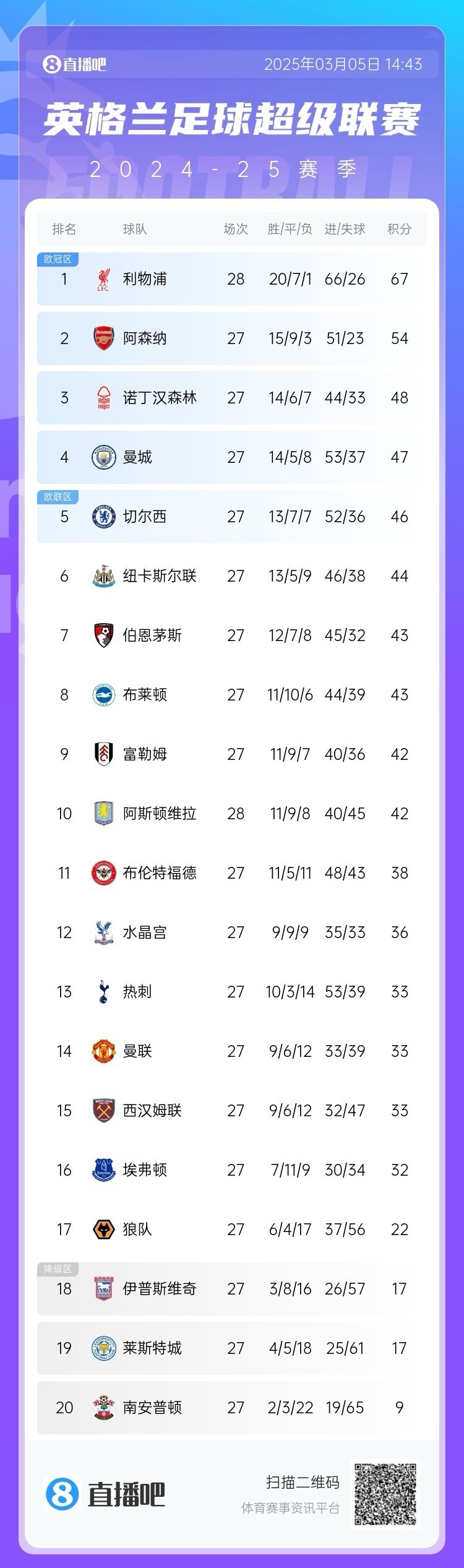 隨著2024/25賽季英超聯(lián)賽進入最后三個月,歐戰(zhàn)資格的爭奪可謂是精彩紛呈。目前排名第三的諾丁漢森林與排名第十的阿斯頓維拉僅有6分差距,不過維拉多賽一場。