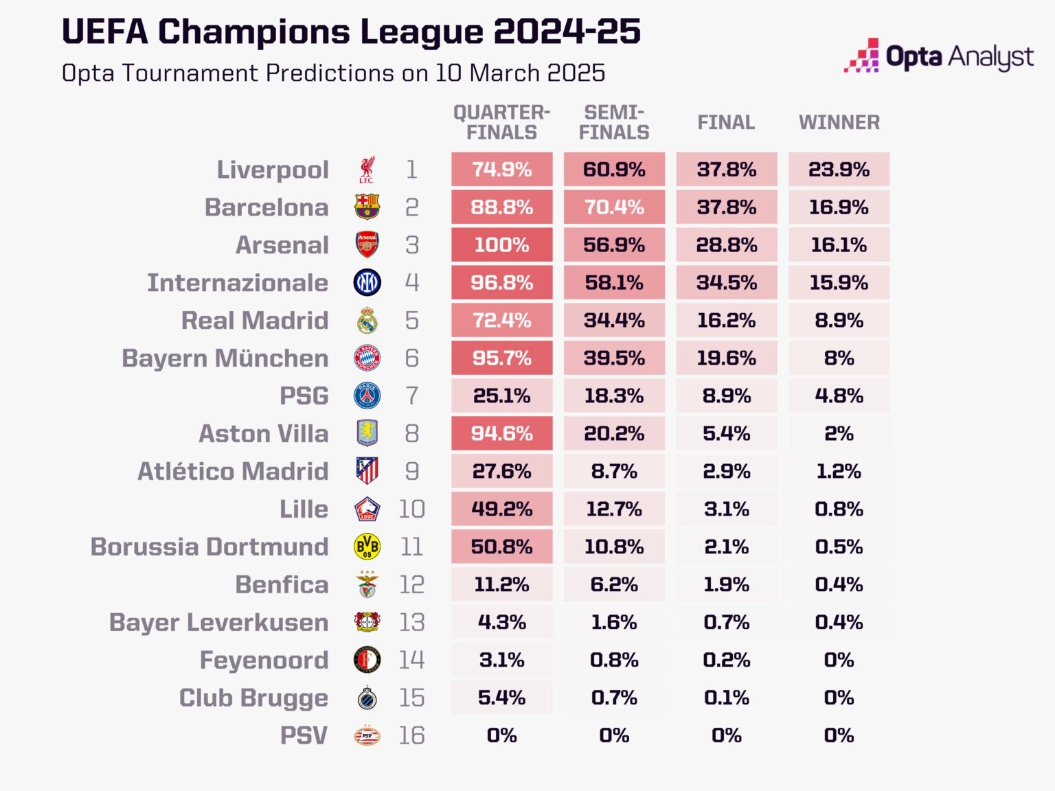 03月11日訊 歐冠1/8決賽次回合今夜明晨開打,半數(shù)8強隊伍將在一晚之內(nèi)決出。數(shù)據(jù)機構(gòu)Opta對歐冠1/8決賽次回合做出了預(yù)測。