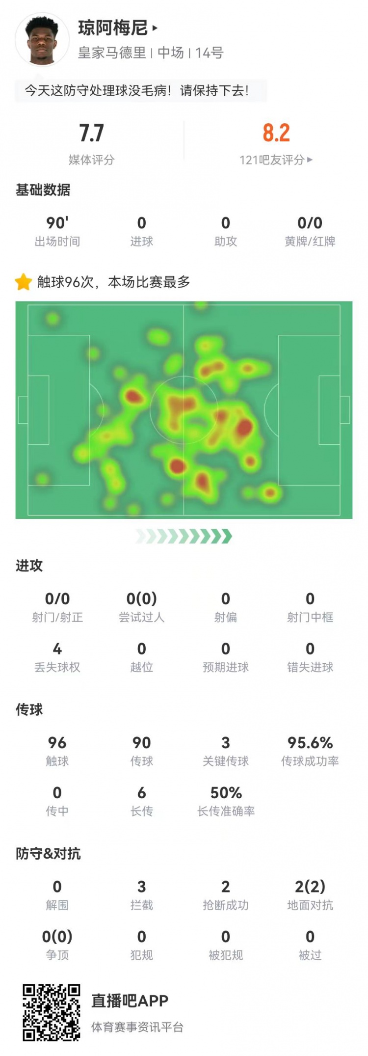 3月5日訊 皇馬在本輪歐冠2-1擊敗馬競(jìng),瓊阿梅尼本場(chǎng)數(shù)據(jù)如下: