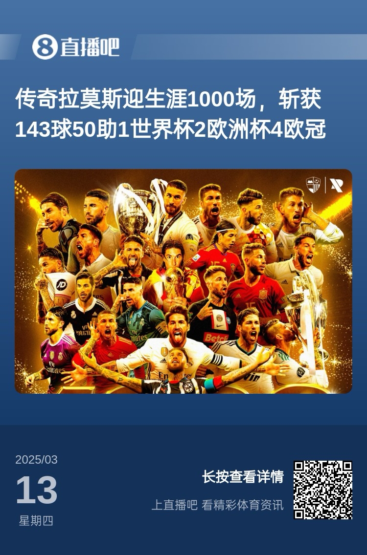 相關(guān)閱讀:傳奇????拉莫斯迎生涯1000場,斬獲143球50助1世界杯2歐洲杯4歐冠