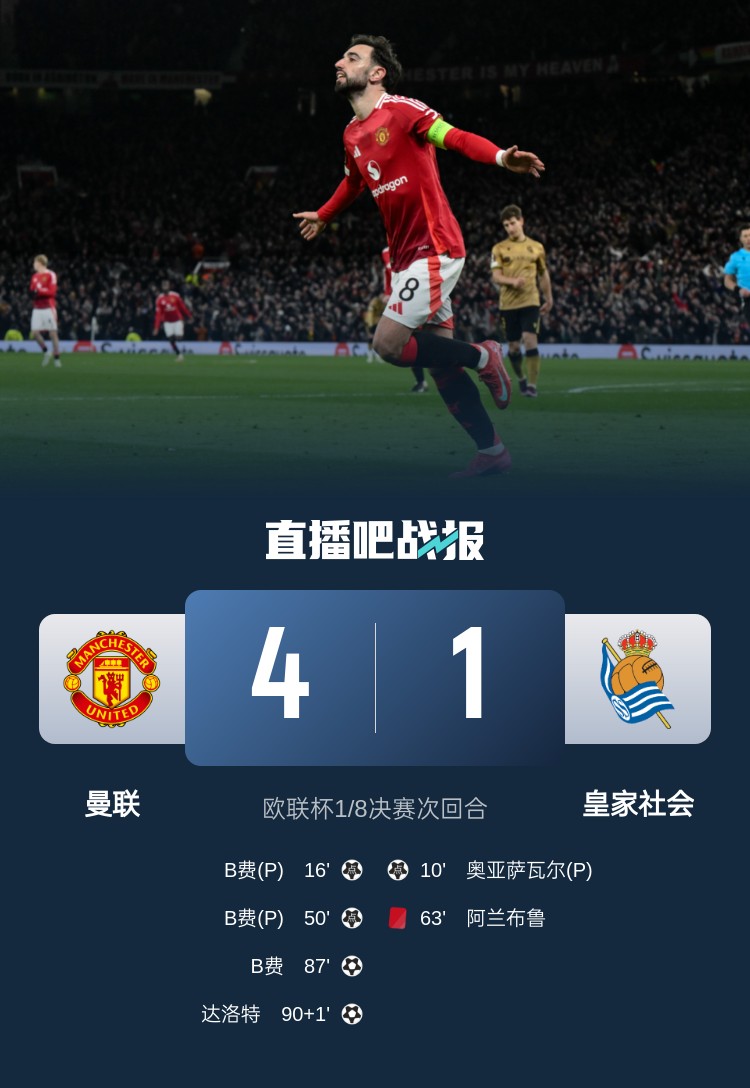曼聯(lián)歐聯(lián)杯16強(qiáng)次回合4-1擊敗皇社,總比分曼聯(lián)5-2晉級(jí)!B費(fèi)完成帽子戲法。