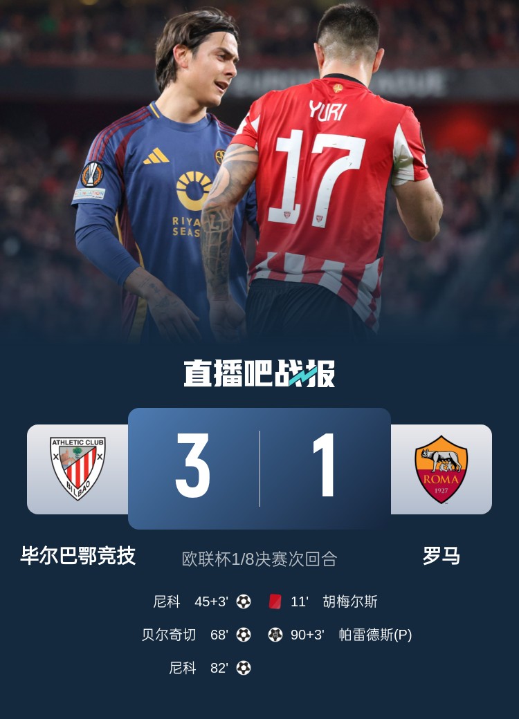 無(wú)緣八強(qiáng)!十人羅馬1-3總比分3-4遭畢巴逆轉(zhuǎn) 胡梅爾斯11分鐘直紅