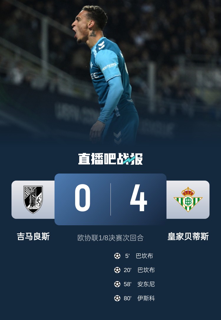 超神夜!安東尼1射1傳+2策動(dòng)獨(dú)造4球 貝蒂斯4-0總比分6-2吉馬良斯
