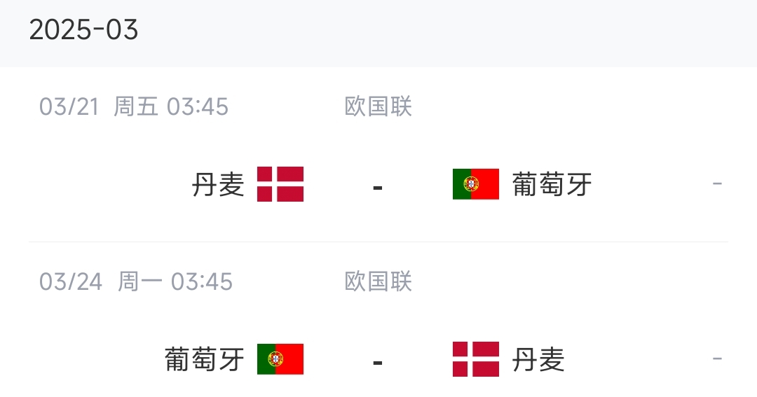 3月份國際比賽日中,葡萄牙將在歐國聯1/4決賽迎來與丹麥隊的兩回合比賽,比賽時間為3月21日和3月24日,葡萄牙先客后主。