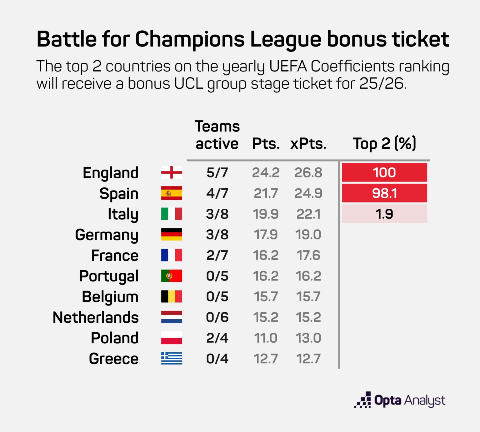 目前英格蘭手握24.25的積分,領(lǐng)先第二名西班牙2.5分。考慮到歐足聯(lián)系數(shù)分系統(tǒng)的運(yùn)作方式,在接下來(lái)的歐戰(zhàn)1/4決賽階段,只要有一支英格蘭球隊(duì)贏得一場(chǎng)比賽,就可以為英超鎖定一個(gè)額外的歐冠聯(lián)賽席位。