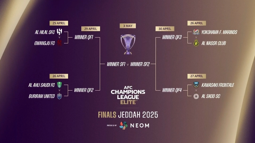 本賽季亞冠精英聯(lián)賽,從1/4決賽開始為集中賽會(huì)制的單場(chǎng)淘汰賽,2025年4月25日至5月4日在沙特舉行。
