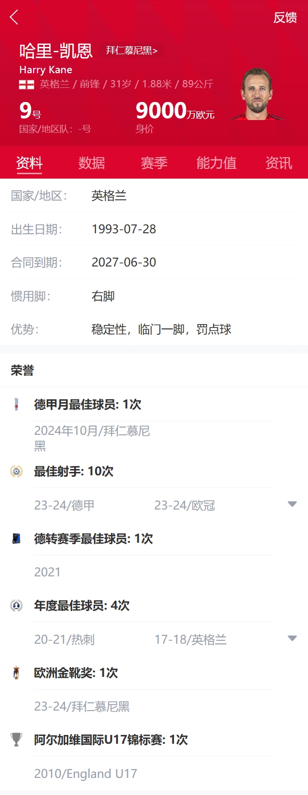 現(xiàn)年31歲的凱恩職業(yè)生涯攻入400多粒進球、斬獲數(shù)十項個人榮譽,但至今還未隨球隊奪得過主要賽事冠軍。